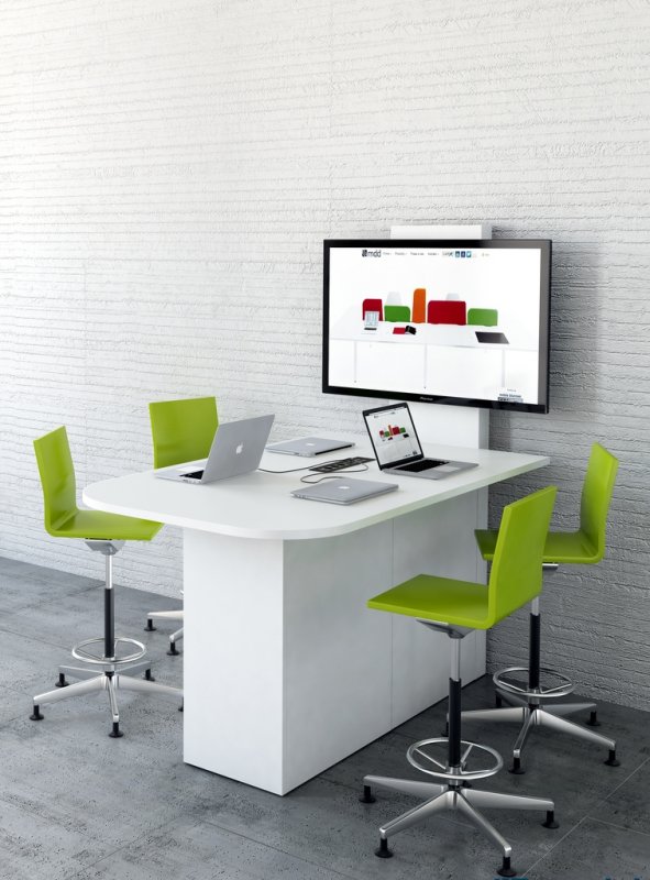 Gelungener Gruppenplatz mit integrierter TV-Halterung für ein kleines Multimediastudio. Für Projektarbeit oder Großraumtisch oder als Springerplatz geeignet. Auch für Seminarräume bietet sich dieser praktische Multimediatisch mit einem hohlen Sockel für das Kabelmanagement an.
